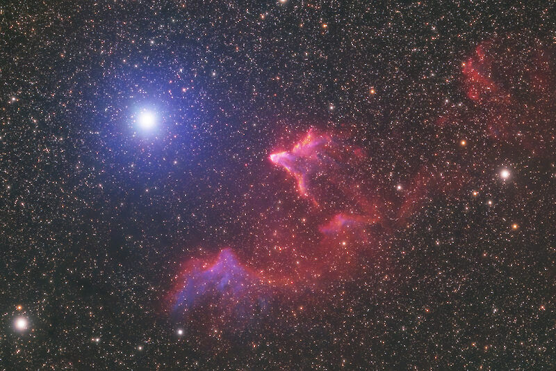 The faint object Ghost of Cassiopeia (IC59/IC63) is both an emission nebula (the glowing red Hydrogen) and a reflection nebula (the blue clouds illuminated by the star).