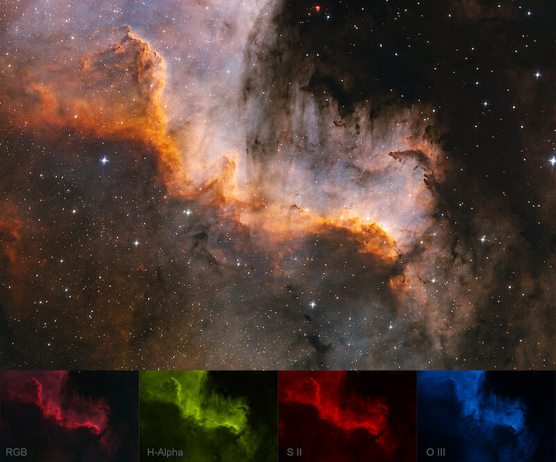 To obtain the colors in this composition I used some sort of a Hubble Palette, so the normally reddish hydrogen image is rendered in green. A miniscule tuning of tone curves was used to mix this kind of unrealistic green with the other layers into different colors. The RGB layer shown on the left resembles the visual colors as we would see it.