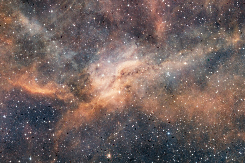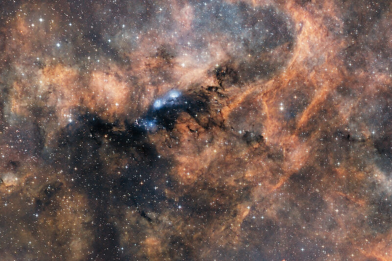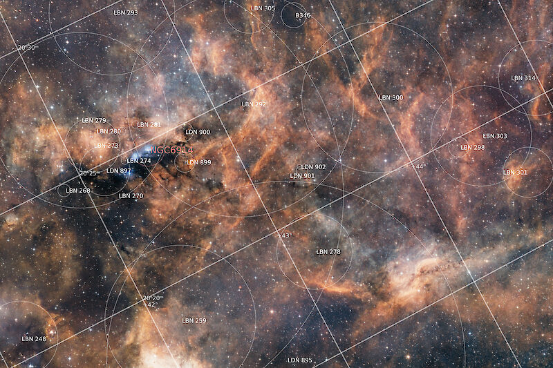 Nevertheless there are some more quite interesting objects to discover which qualify to be imaged with a larger focal length. One prominent example is the bright reflection nebula NGC6914, surrounded by several dark nebulae.