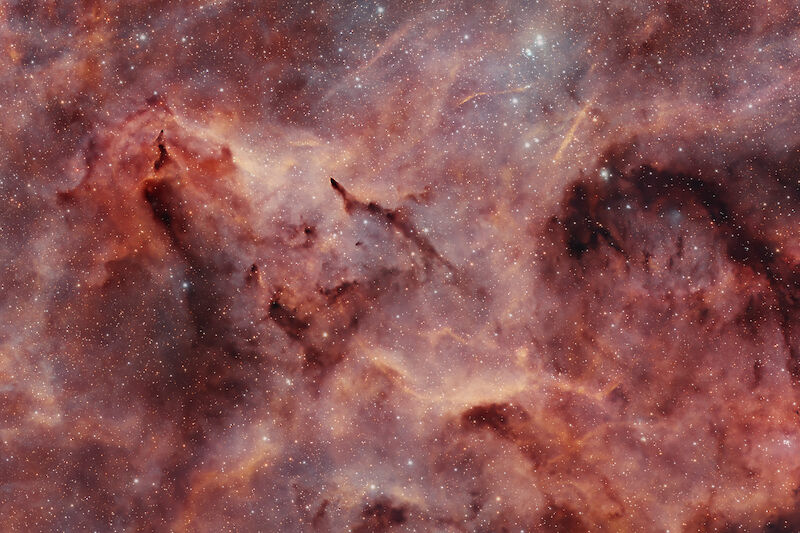 The whole region contains plenty of denser areas, where new stars will born eventually due to gravitational effects. These are observable as brighter or darker structures: