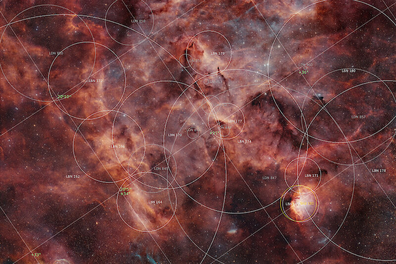 Next to the Tulip Nebula there is a noticeable blueish arc, formed of compressed molecular Oxygen. This is a so called bowshock, created by an intense stream of particels originating from the black hole Cygnus X-1. By the way, Cygnus X-1 was the first ever black hole proven within the Milky Way back in 1972.