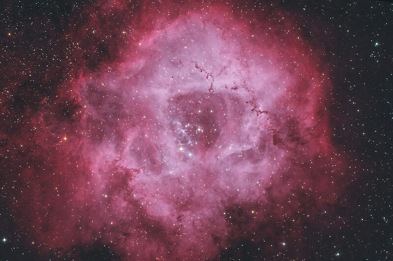 The hydrogen and oxygen contained in this gigantic molecular cloud with a diameter of roughly 130 lightyears in constellation Monoceros are excited from a couple of young stars and so generate the iconic shape of the Rosette Nebula.