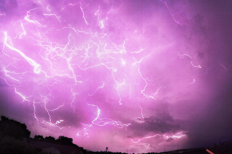 Taken during the late evening of June, 29 when an extraordinary powerful stormcell ran across Germany. I used my GoPro to take a video and picked interesting frames to create this composite. It combines about 120 individual flashes into a single frame.