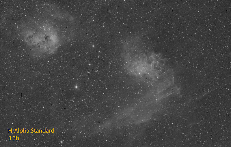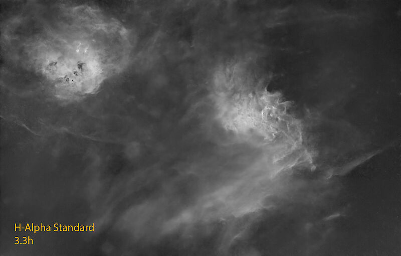 The rest of the short window within the clouds was used to collect 1.6 hours H-Alpha from the Flaming Star Nebula, which was captured exactly one year ago and contains a total of 3.3 hours of this band. The new stack was taken with a clear sky and about 50% Moon, the older stack was taken at full Moon and a more humid air (star halos). The full Moon does not affect the image quality significantly when using the refractor, but it may cause some additional degradation in contrast with the fast telescope.