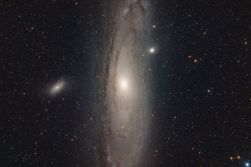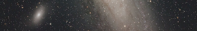 The next image shows the full frame in a manual edit (580mm, ASI2600MM, LRGB 1h). The strange framing was chosen to safely capture M31 and M32 as well.