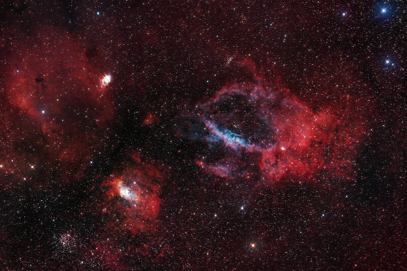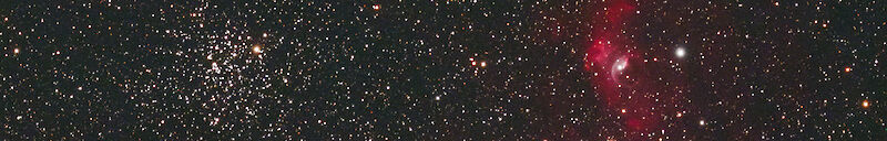 Der offene Sternhaufen M52 befindet sich im Sternbild Kassiopeia unmittelbar neben einer größeren H-Alpha Region, welche auch die Emissionsnebel NGC7635 (Blasen Nebel, gut erkennbar an seiner Form) und NGC7538 (Nördlicher Lagunennebel) enthält.
