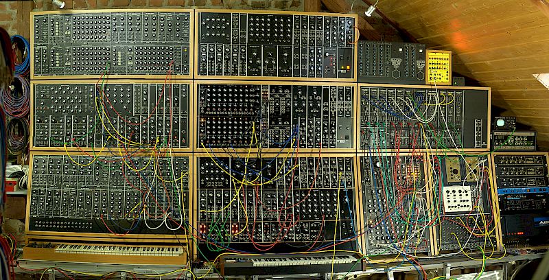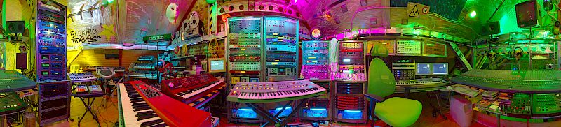 This huge modular synthesizer is named Walhalla and resides in the Synxss Studio, Offenbach. The major approach was to create an image, where all modules are clearly recognizable. The resolution of a normal digital camera is far too low for this. So I built this 2D panorama from 25 single images and stitched them together.