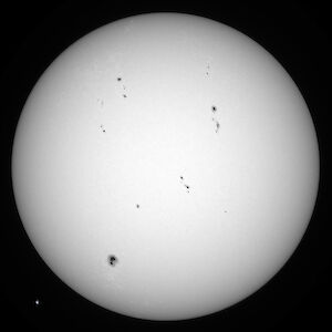 Die Sonnenflecken sind dabei relativ einfach zu beobachten und verändern sich, über Tage hinweg, kontinuierlich. Ihre Größe kann durchaus beachtlich sein. In dem Bild oben habe ich zum Vergleich in die linke untere Ecke die Erde in der korrekten Größe montiert (wir befinden uns natürlich nicht an dieser Position neben der Sonne). In der Aufnahme hat die Sonne einen Durchmesser von 2120 Pixeln, sie hat den 109 fachen Durchmesser der Erde, entsprechend beträgt der Durchmesser der einmontierten Erde 19,5 Pixel. Der große Sonnenfleck ist mit einer Länge von ca. 70 Pixeln mehr als dreimal größer und konnte, mit entsprechendem Sonnenfilter, sogar visuell ohne Teleskop erkannt werden.