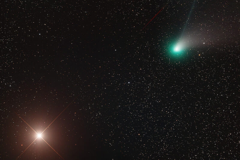 Am 10.2.2023 öffnete sich kurz die Wolkendecke und ich konnte noch einmal den Kometen einfangen, während er, aus unserer Perspektive, am Mars vorbeiflog: