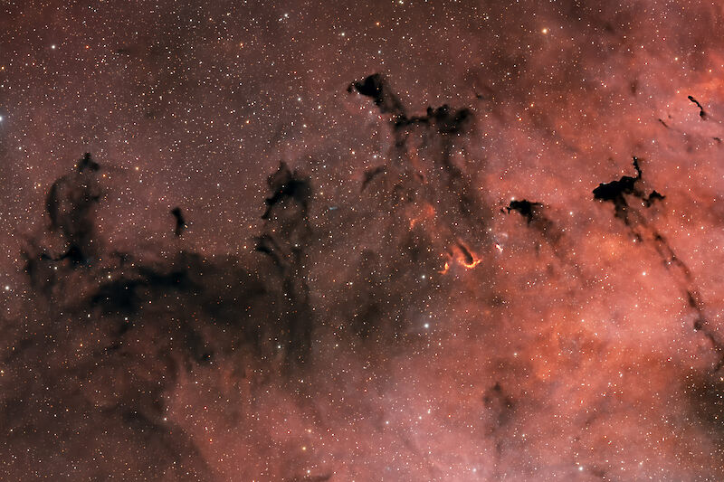 Bereiche mit einer hohen Moleküldichte, welche aus unserer Perspektive vor der ionisierten Wolke liegen, verdecken diese und sogar dahinter liegende Sterne, und erscheinen als Dunkelnebel: