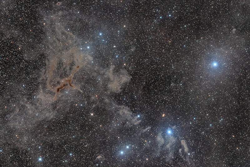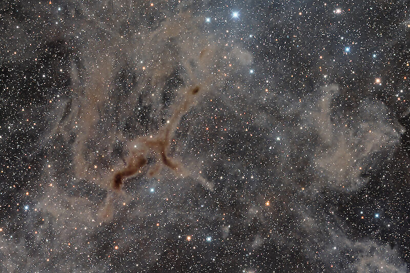 Im Bereich der Sternbilder Kassiopeia und Kepheus gibt es einige hübsche helle und dunkle Nebel, wie diese Gruppe.