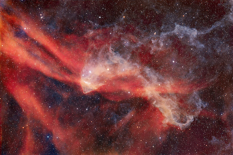 Neben diesen prominenten Elementen verstecken sich in diesem Bereich aber auch noch ein paar andere interessante Objekte. Bei genauem Hinschauen entdeckt man in der Mitte des hellen dreieckigen Bereiches tatsächlich auch einen echten Reflexionsnebel. Dieser wird beleuchtet von einem sogenannten Herbig Haro Objekt, also von einem Stern ausgestoßene Gase, welche auf interstellare Materie treffen. Als Phase der Sternentstehung sind diese Objekte aus astronomischer Sicht relativ kurzlebig und überdauern nur einige tausend Jahre.