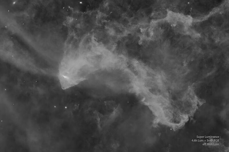 Besonders interessant wird so ein Direktvergleich zwischen den Schmalband-Daten in Hydrogen alpha und der Luminanz bzw. der von mir verwendeten "Super-Luminanz". Für die Super-Luminanz werden die Luminanz-Subs zusammen mit den RGB-Subs gestackt, um die in den RGB-Subs enthaltene Luminanz beim Kombinieren nicht zu verlieren. Dadurch verdoppelt sich hier fast die effektive Integrationszeit der Luminanz auf 8,6 Stunden.