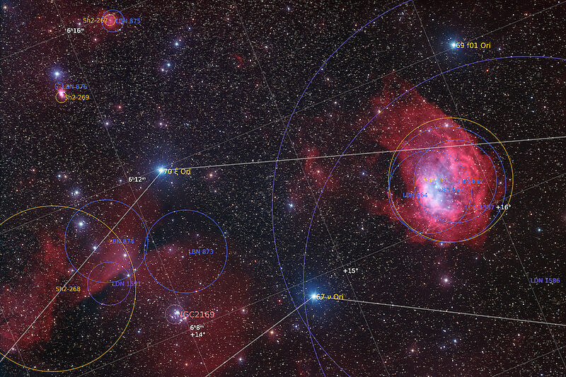 Inmitten der ausgedehnten H-Alpha-Region befindet sich im Kern eine scheinbar abgegrenzte Wolke aus Sauerstoff, hier bläulich dargestellt. All dies wird von dem hellen Stern HD41997 zum Leuchten amgeregt.
