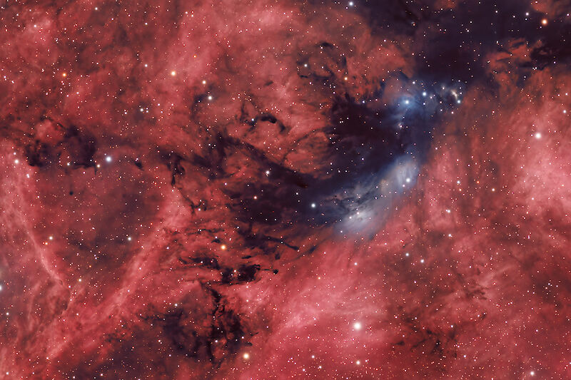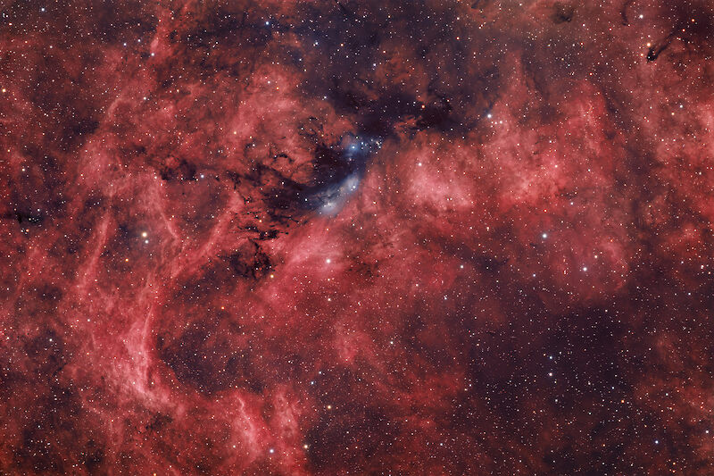 In den großen H-Alpha Regionen finden sich immer wieder interessante Reflexionsnebel, wie hier NGC6914 im Sternbild Schwan. In diesem Fall beleuchten die sehr hellen, jungen Sterne Teile der dichten Molekülwolke und offenbaren so ihre Struktur, während der Rest als Dunkelnebel den Hintergrund verdeckt.