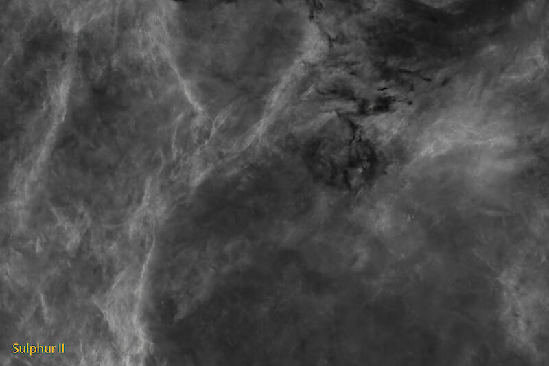 Die ungewöhnlich lange Integrationszeit in Schwefel wird verwendet, um den hellen Flächen in H-Alpha etwas Struktur zu verleihen. Die Betrachtung des S2-Layers ist entsprechend interessant, allerdings ist Schwefel üblicherweise deutlich schwächer und benötigt entsprechend mehr Integrationszeit.