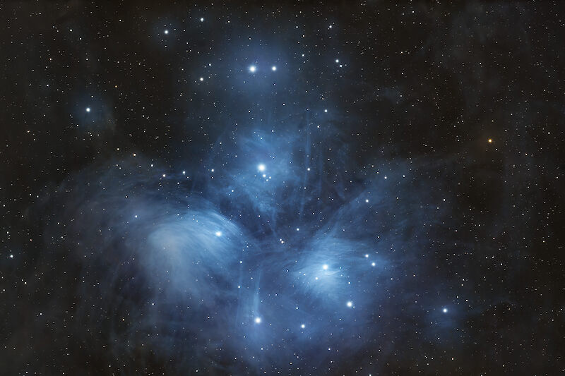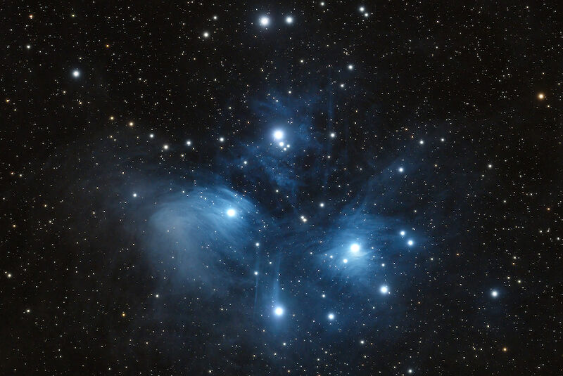 Der offene Sternhaufen der Plejaden ist ein willkommenes Objekt für die visuelle Beobachtung. Aber erst bei längerer Belichtung werden die bläulichen Reflektionsnebel sichtbar.