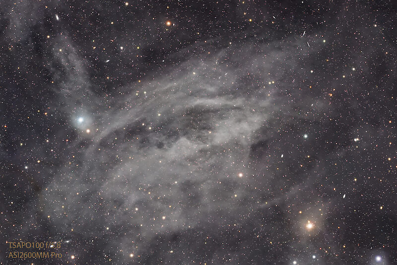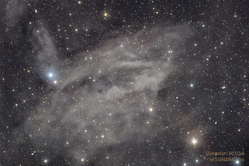 Das Experiment war allerdings nicht, ob mir davon eine Aufnahme überhaupt gelingt, sondern einmal herauszufinden, welche Ergebnisse sich mit zwei gänzlich unterschiedlichen Setups erreichen lassen. Also belichtete ich parallel mit dem Monochron-Setup (ASI2600MM, Antlia LRGB) am 100mm f/5.8 (580mm Brennweite) Refraktor und der OSC (ASI2600MC, keine Filter) am schnellen 130mm f/2.8 Hypergraphen (360mm).