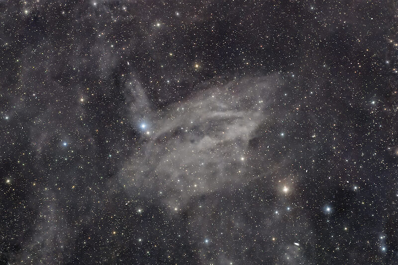 Beim Vergleich der Rohdaten fällt eine leicht unterschiedliche Gesamtfärbung auf, und zwar trotz einer spektrophotometrischen Farbkalibrierung in PixInsight (SPCC). In der Bearbeitung habe ich versucht, dies bei dem Reflexionsnebel einigermaßen anzugleichen, bei den Sternen gelingt das jedoch nicht. Die Ursache sind mit einiger Sicherheit die überlappenden Filterkurven der Bayer-Maske in der OSC und dass ich bei der Kamera keinen UV/IR Cut-Filter verwendet hatte.