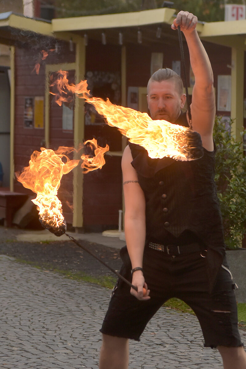 Die Feuershow "Funkenflug"bei der Andersland Gala 2023 in der Kulturhalle Stockheim. Mehr Informationen und Künstler finden sich bei der Künstleragentur Andersland.