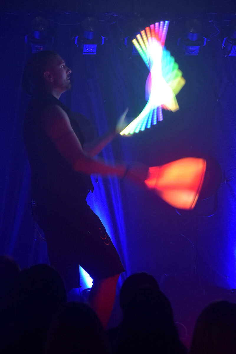Leuchtjonglage "Funkenflug"bei der Andersland Gala 2023 in der Kulturhalle Stockheim.Mehr Informationen und Künstler finden sich bei der Künstleragentur Andersland.