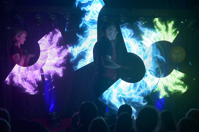 Spektakuläre Lichtjonglage bei der Andersland Gala 2023 in der Kulturhalle Stockheim. Mehr Informationen und Künstler finden sich bei der Künstleragentur Andersland.