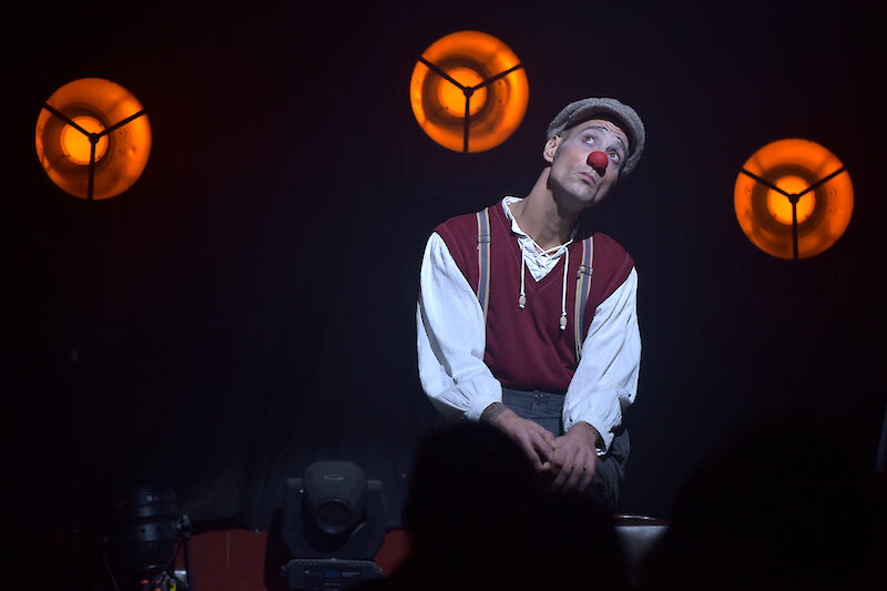 Der nachdenkliche Clown Toni bei der Andersland Gala 2023 in der Kulturhalle Stockheim. Mehr Informationen und Künstler finden sich bei der Künstleragentur Andersland.