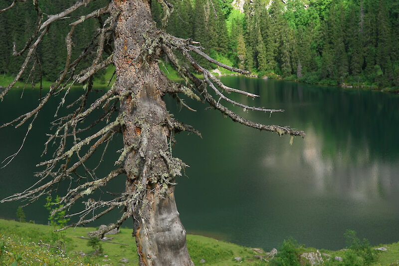 Vor dem dunkelgrünen Hintergrund kommt dieser alte Baum noch einmal richtig zur Geltung.