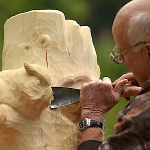 Schnitzler beim Anfertigen einer neuen Figur auf dem Schnitzlerweg Axalp (Berner Oberland, Schweiz). Mehr Bilder.