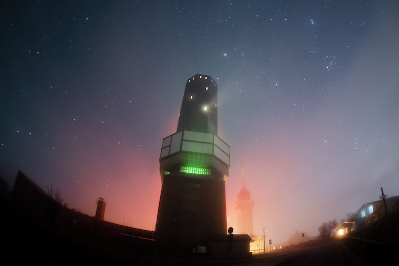 Der Sendeturm auf dem Großen Feldberg im Taunus wurde in 1951 neu errichtet und steht mittlerweile unter Denkmalschutz. Von hier wird Hessen mit digitalem Fernsehen und Rundfunk versorgt. Zwar hatte ich eine klare Sicht auf den Sternenhimmel erhofft, doch ohne den Wolkenschleier wäre diese Aufnahme so nicht möglich gewesen.