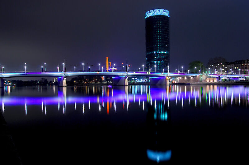 Die feine blaue Beleuchtung an der Friedensbrücke gibt dem Bild das notwendige Fundament. Interessant ist hier die leicht violette Tönung.