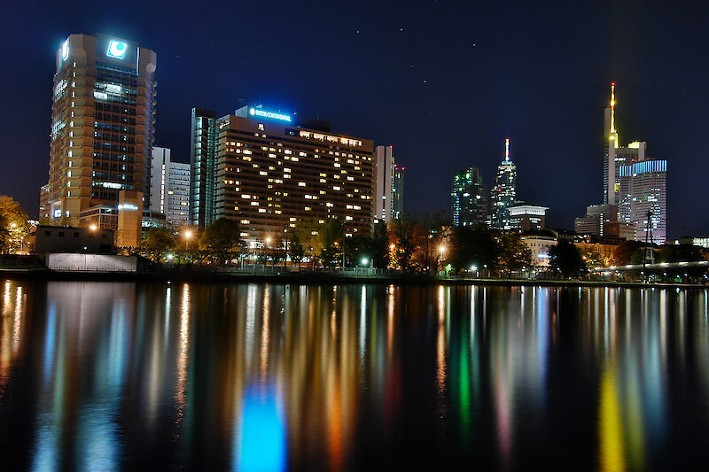 Damit bei dieser nächtlichen Aufnahme die Lichter nicht überstrahlt werden und dennoch die Fassaden erkennbar bleiben, wurde eine Belichtungs-Sequenz aus 7 Aufnahmen erstellt und diese per DRI-Technik zusammengefügt.