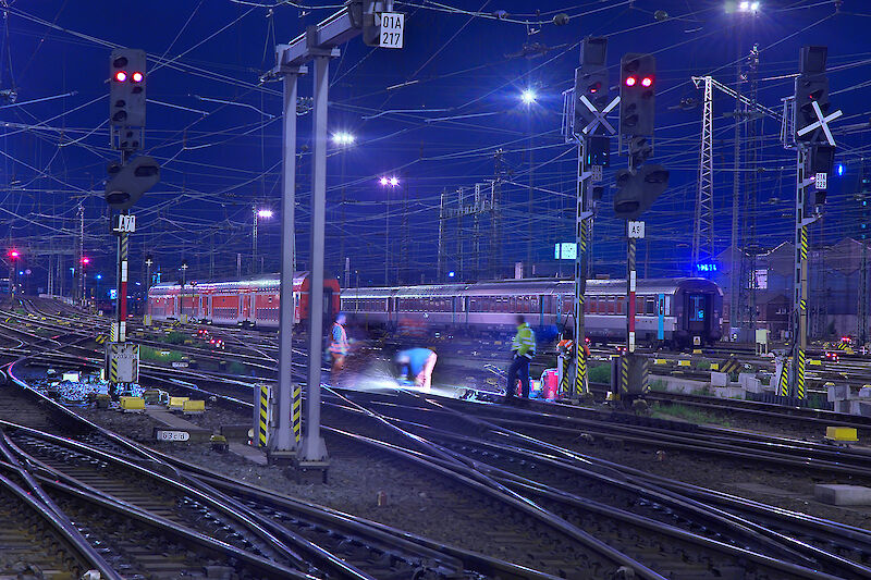 Dies ist in der Tat eine extreme DRI-Komposition. Die hellen Schweiß-Lichter sind um viele Blendenstufen heller als das umgebende Licht. Der intensive Blauton wurde durch manuellen Weißabgleich auf die gelbliche Natriumdampf-Beleuchtung erreicht, die hier folgerichtig weiß erscheint.