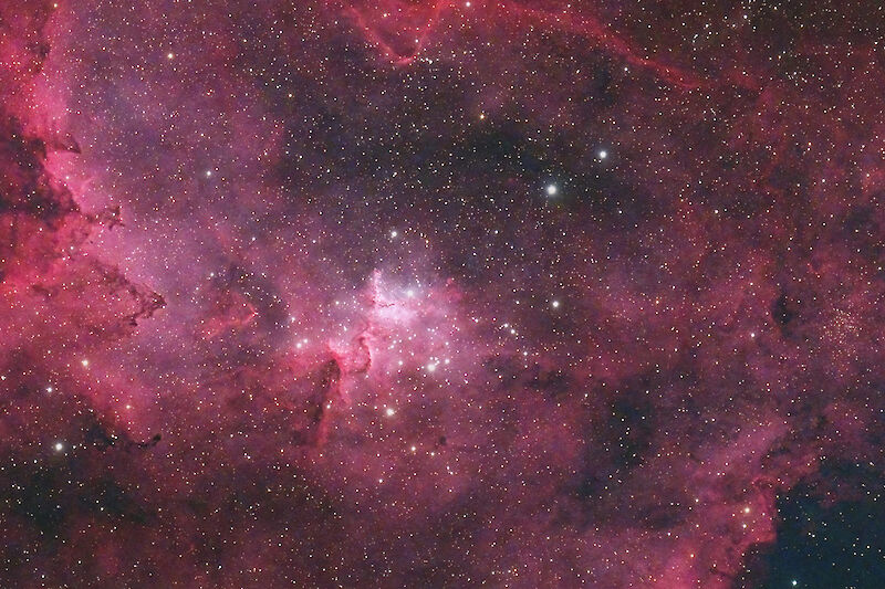 Das Ganze wird noch komplizierter, wenn man mit der monochromen Kamera und Schmalbandfiltern auch die typischen Emissionslinien von Wasserstoff, Sauerstoff und Schwefel einfängt. Dann hat man einmal die Möglichkeit, diese Ebenen mit ihren natürlichen Farben in das Bild zu setzen, oder ein gänzlich anderes Farbschema zu wählen, um beispielsweise feine Details besser herauszuarbeiten.