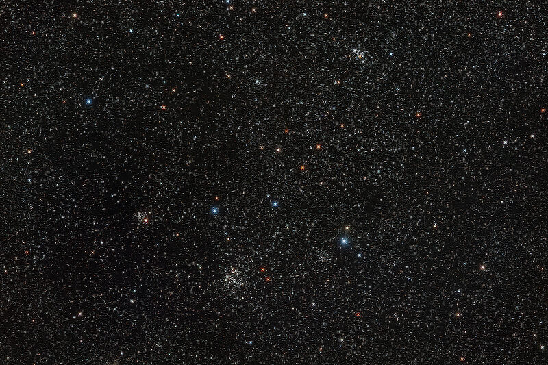 In unmittelbarer Umgebung zu M103, hier oben rechts im Bild, befinden sich noch weitere Sternhaufen, wie NGC654, NGC663 und NGC659 in der unteren Bildhälfte: