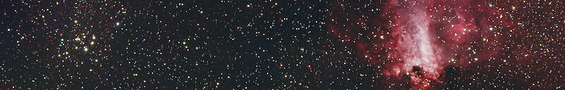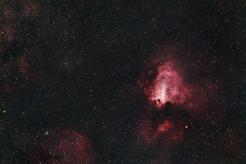 Die folgende Aufnahme zeigt das gesamte Bild mit M17 und M18 in einer manuellen Bearbeitung (580mm, ASI2600MM, LRGB 1h).