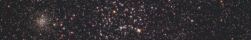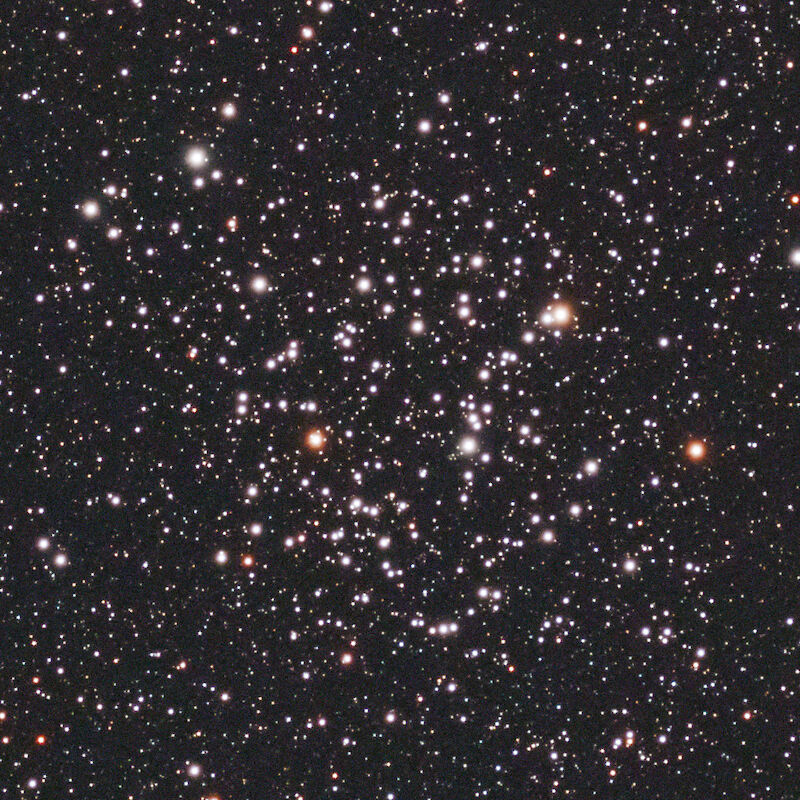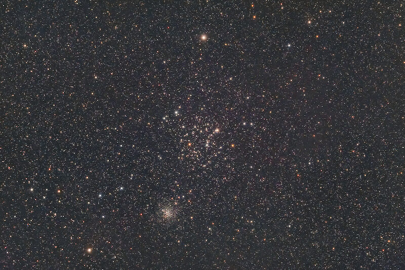 Wie im Bild oben und unten zu sehen ist, findet man in unmittelbarer Nähe noch einen weiteren Sternhaufen, NGC2158, der aus kleineren Sternen zu bestehen scheint. Tatsache ist allerdings, dass dieser mit ca. 11000 Lichtjahren rund viermal weiter von uns entfernt ist.