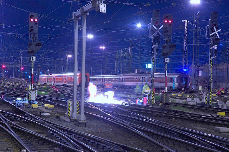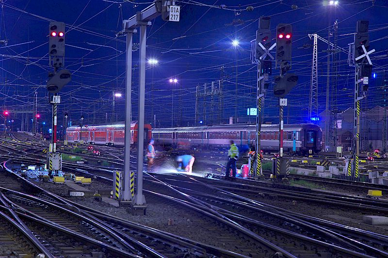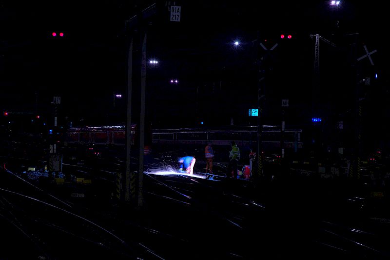 Arbeiter überbelichtet, Lampen überstrahlt.