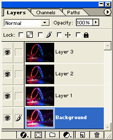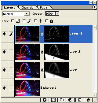 Dann wird eine Grafik-Software benötigt, welche Ebenen und Transparenz-Masken beherrscht. Erstellen Sie dort ein neues Projekt und laden Sie alle Quelldateien als einzelne Ebenen hinein; die hellste Variante kommt ganz nach unten. Bei Photoshop 6 (in 2005) sah das dann etwa so aus wie im Bild links.