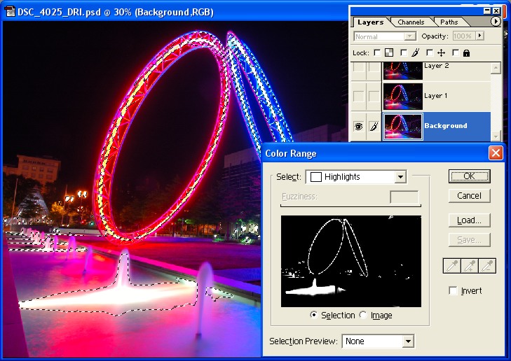 Nach Bestätigung der Farbbereichs-Auswahl werden die ausgewählten Bereiche wie im Bild angezeigt. Man kann leicht erkennen, daß in diesem Fall zwar die Fontäne, jedoch nicht die restliche Wasseroberfläche ausgewählt wurde. Da ich auch gerne die Oberfläche durch eine der unteren Ebenen ersetzt hätte, habe ich diese im Markierungs-Modus manuell der Auswahl hinzugefügt.